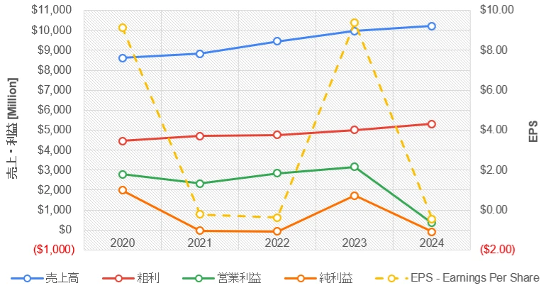 株価は、記事執筆時点で約$140で推移。2024年からは約40%ダウンしています。EV/EBITDA(企業価値/EBITDA倍率)は約9.6倍。過去5年間の平均の14.9倍と比較して低く、割安感が強いと言えます。(EVは時価総額に近い企業の価値、EBITDAは営業利益に近い本業のキャッシュを稼ぐ力)。
